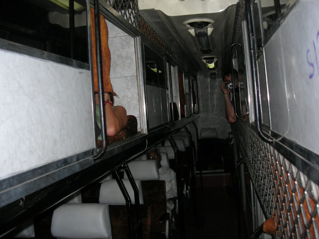 Normaal rijd ik altijd “mee”, maar met de rijstijl in India kun je beter de ogen dicht doen en hopen dat alles goed gaat. Na de eerste pp pauze proberen we wat te slapen (we hadden per slot van rekening een sleeper).  Dat ging wonder wel nog goed ook. Een sleeper bus is een gewone bus waarbij het bagage rek boven de zitplaatsen wat groter is gemaakt en dat zijn dan de sleeper plaatsen. De zitplaatsen eronder zijn gewoon bezet. Het is wel vies allemaal dus een sjawl en iets schoons om je hoofd op te leggen is geen overbodige luxe. Het luikje kun je dicht doen, zodat je beetje privé maar krap met z’n 2-en ligt.