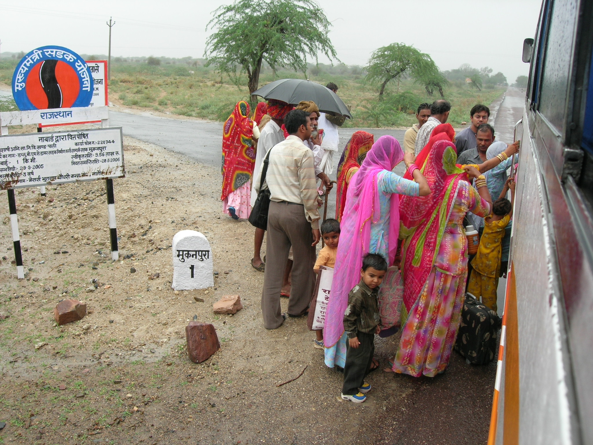 Een “taxi”chauffeur biedt aan te proberen ons via een omweg ons daar te brengen. Trudy hoorde in de bus van alle Indiaase medereizigers dat dit niet mogelijk is. Er is geen  alternatieve weg en het water staat tot aan je middel, er is geen doorkomen aan. Waarschijnlijk zei deze man alleen maar wat om ons later, tegen veel geld, alsnog naar Jhodpur te kunnen brengen. We willen niet hulpeloos in dit vrij verlaten gebied ons geluk beproeven en we besluiten door te reizen met dezelfde bus naar Johdpur. We kopen kaartjes bij en vergeten Ranakpur.